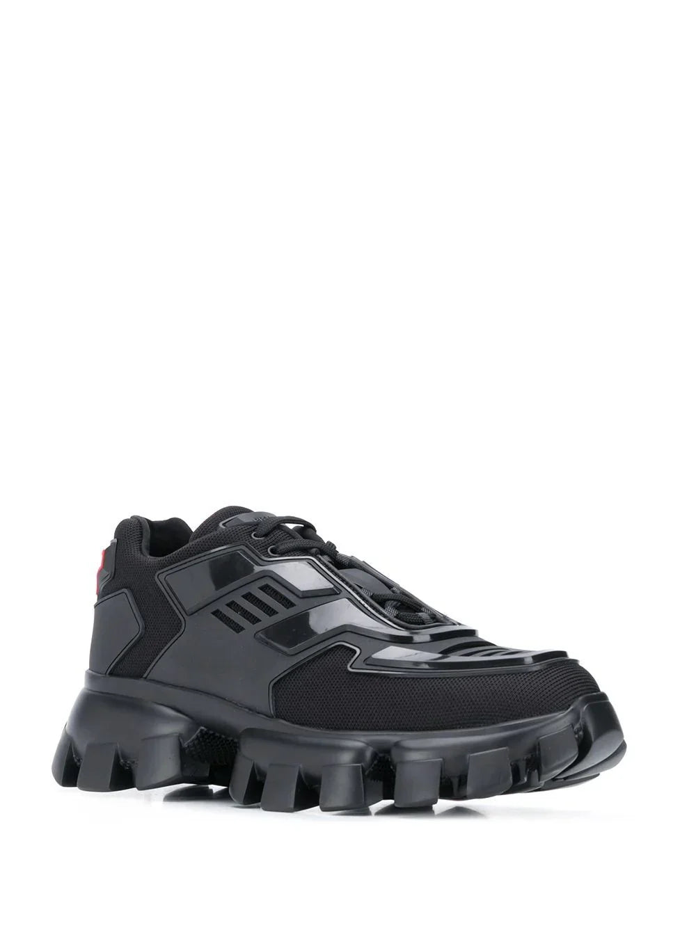 Prada infuses technical materials with futuristic rubberised logo tabs and graphic prints to produce innovative and utopian inspired collections season after season. Crafted from a black technical fabric upper and three-dimensional injected rubber eyestay elements, these Cloudbust Thunder sneakers feature a round toe, a lace-up front fastening, a logo patch at the tongue, branded heel counter and a Sawtooth rubber sole.